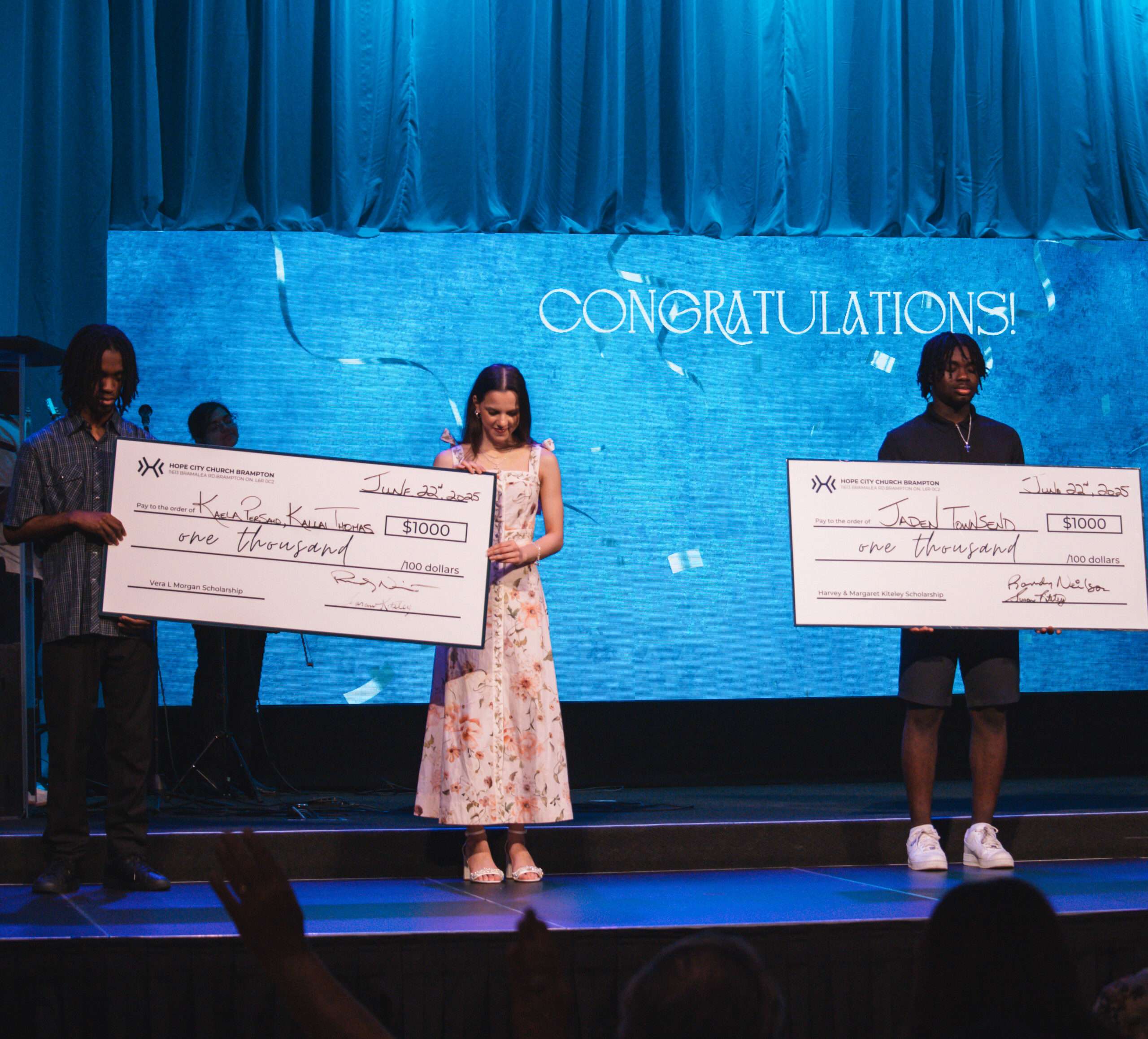On June 22nd, 2025, Hope City Brampton celebrated its Annual Graduation Sunday by awarding four $1,000 scholarships to outstanding high school graduates. These scholarships, named in honour of the church’s founders (Peter and Vera Morgan and Harvey and Margaret Kiteley) support students pursuing higher education.